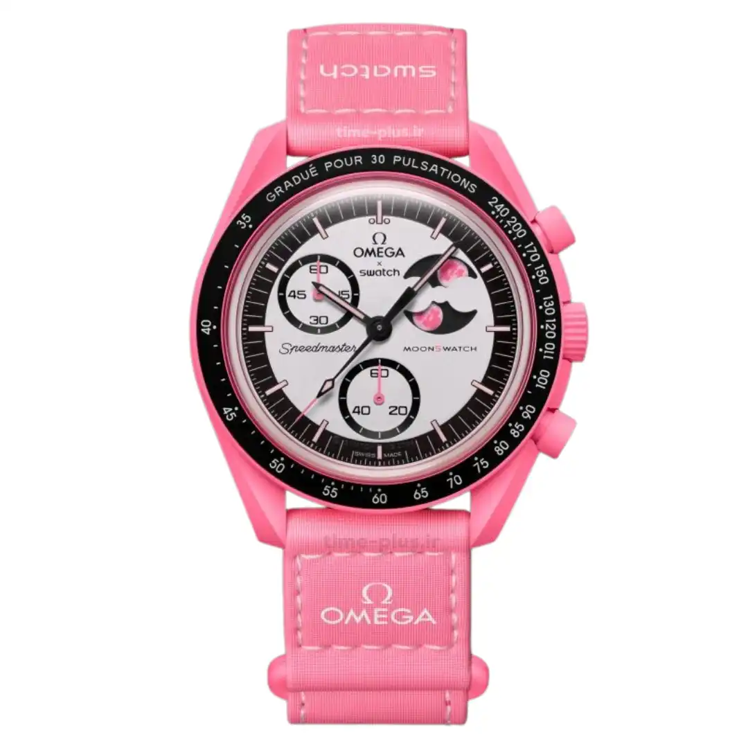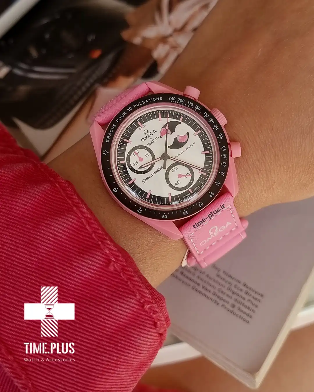 ساعت امگا سواچ مدل Pink Moon با طراحی جذاب و رنگ صورتی، مناسب برای آقایان و بانوان است و الهام گرفته شده از مدل اسپیدمستر میباشد.