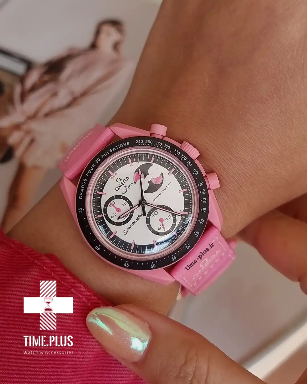 ساعت مچی زنانه Pink Moon امگاسواچ ساعت امگا سواچ مدل Pink Moon با طراحی جذاب و رنگ صورتی، مناسب برای آقایان و بانوان است و الهام گرفته شده از مدل اسپیدمستر میباشد.