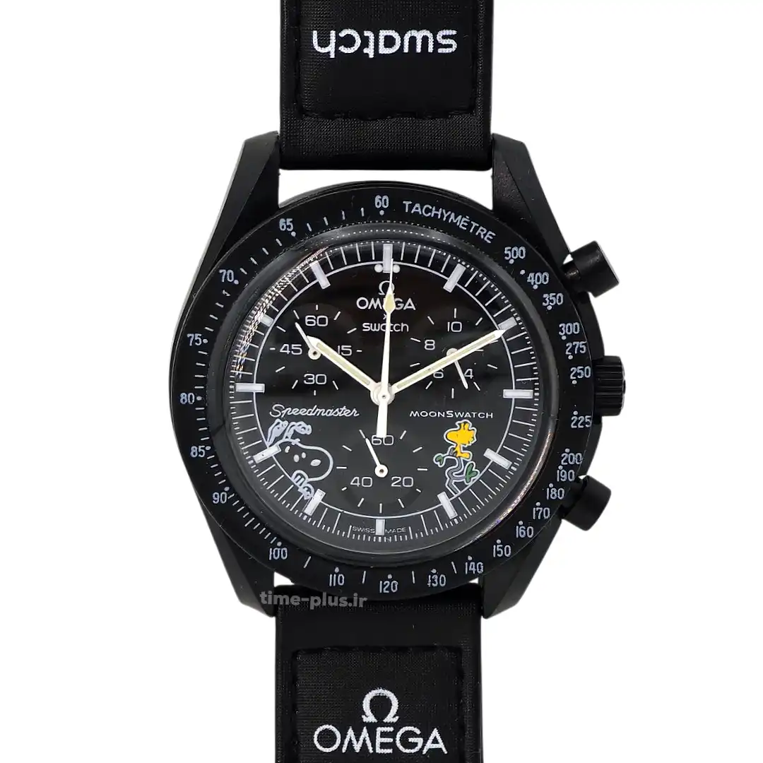 ساعت امگا سواچ اسنوپی مشکی استیکر با طراحی منحصر به فرد، ترکیبی از خلاقیت و زیبایی را ارائه میدهد و مناسب آقایان و بانوان است.