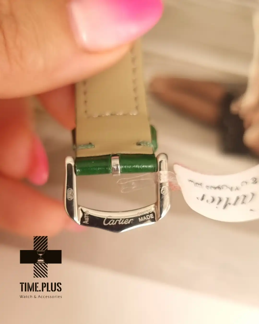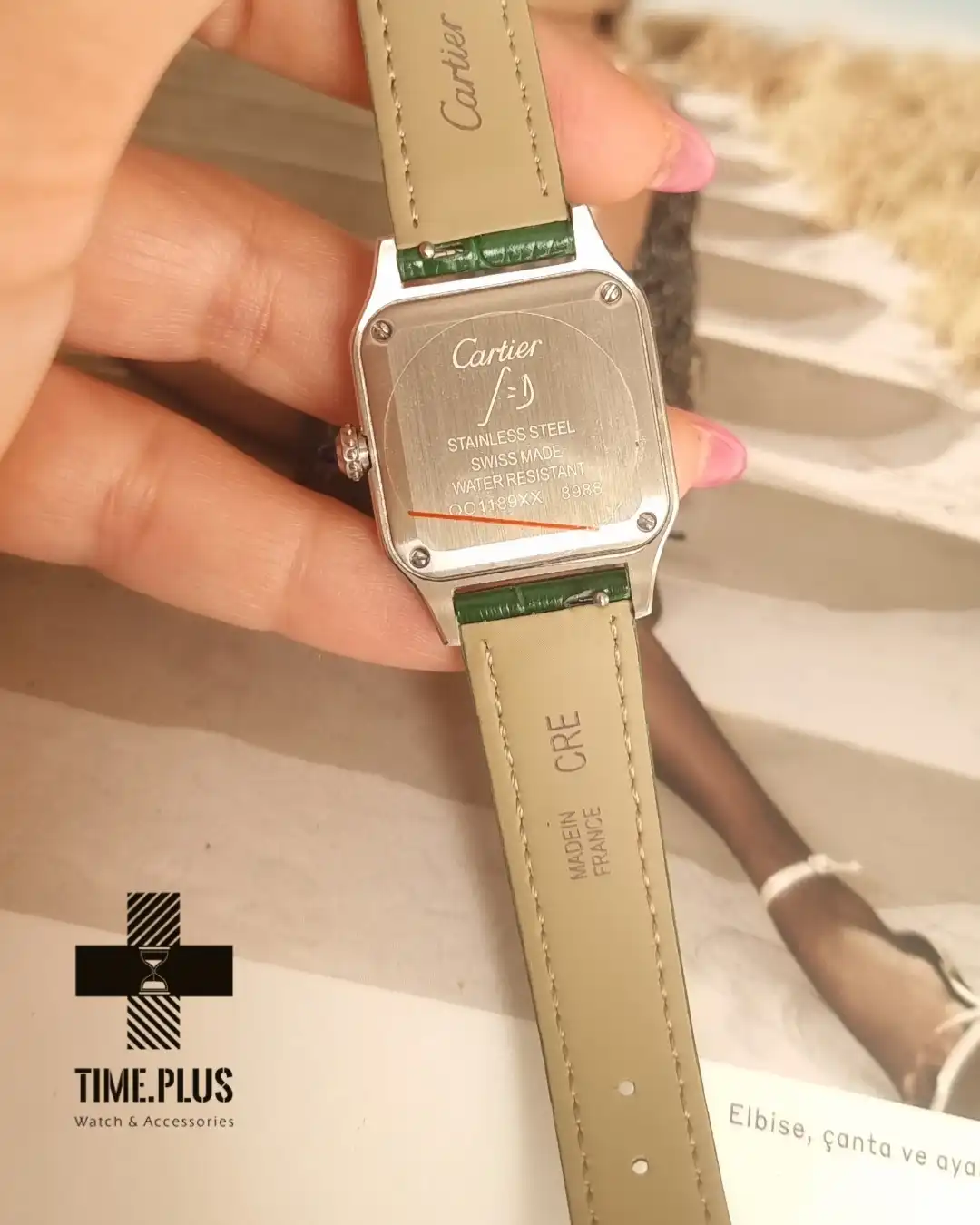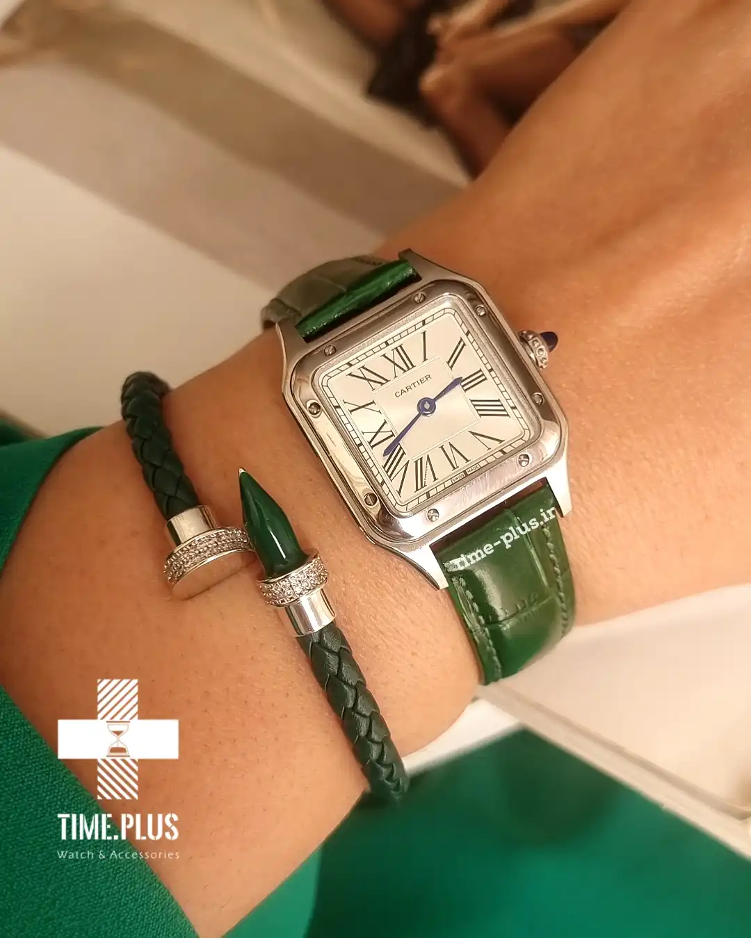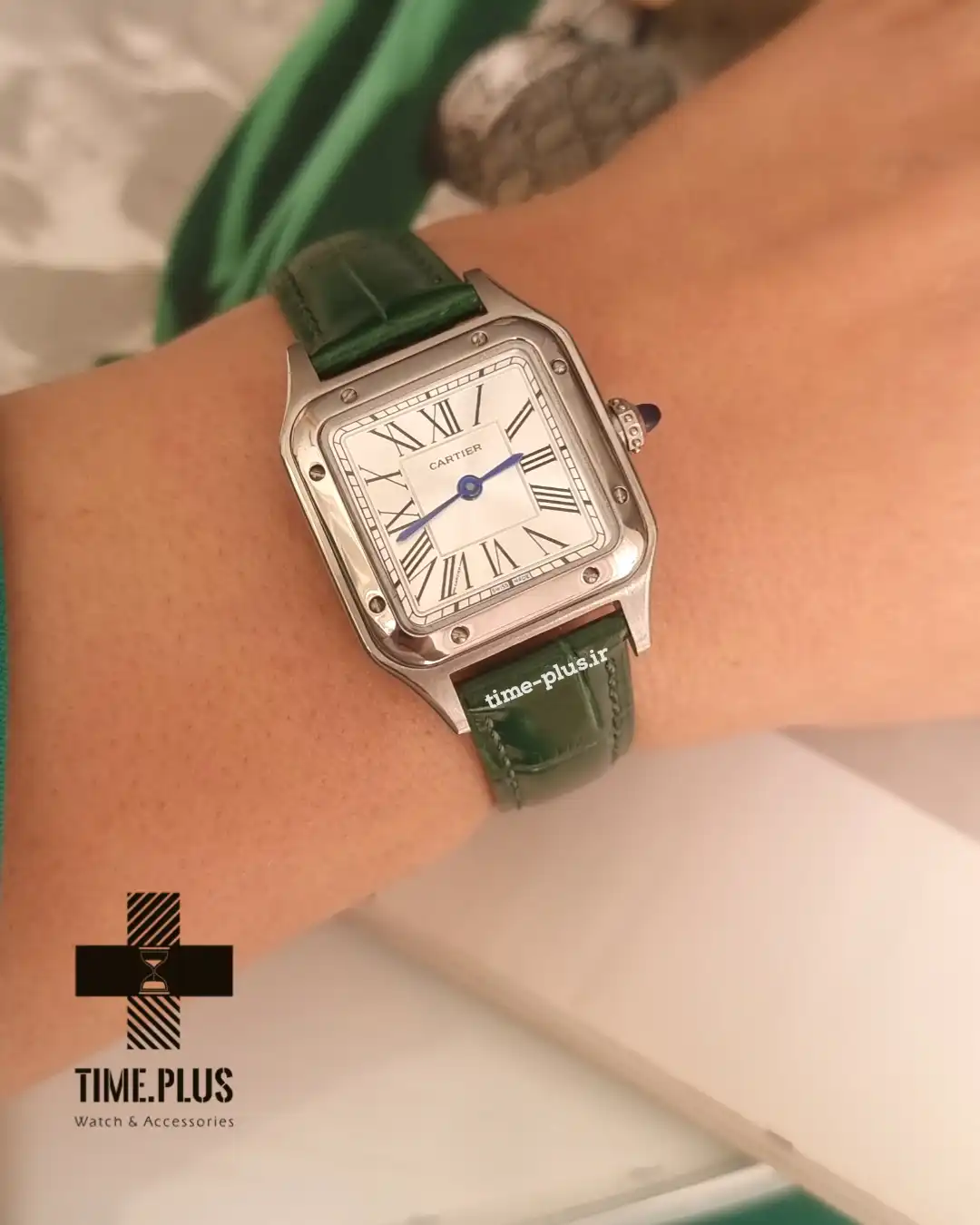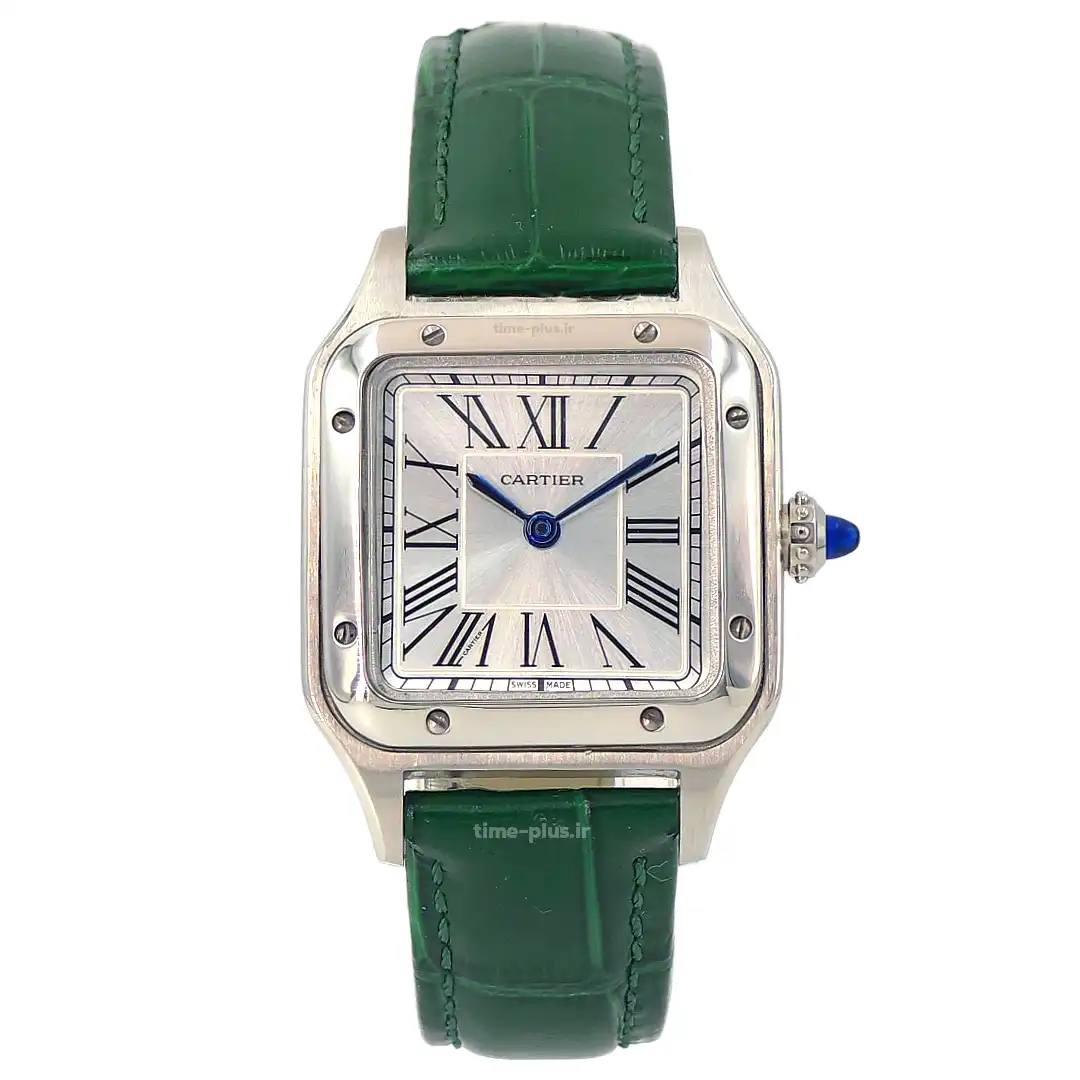 ساعت کارتیه سانتوس دومونت، نمادی از ظرافت و طراحی بینقص، با بند چرمی سبز و ویژگیهای لوکس ارائه شده است.