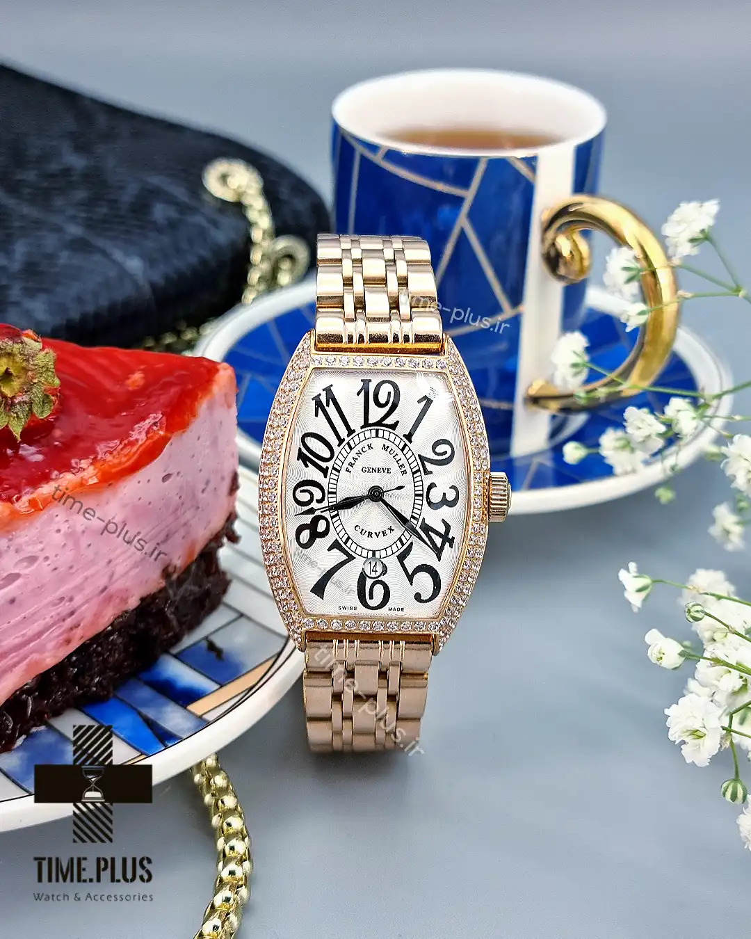ساعت زنانه Curvex از برند فرانک مولر با طراحی زیبا و رنگ رزگلد، گزینهای مناسب برای استفاده روزمره و مهمانیها است.