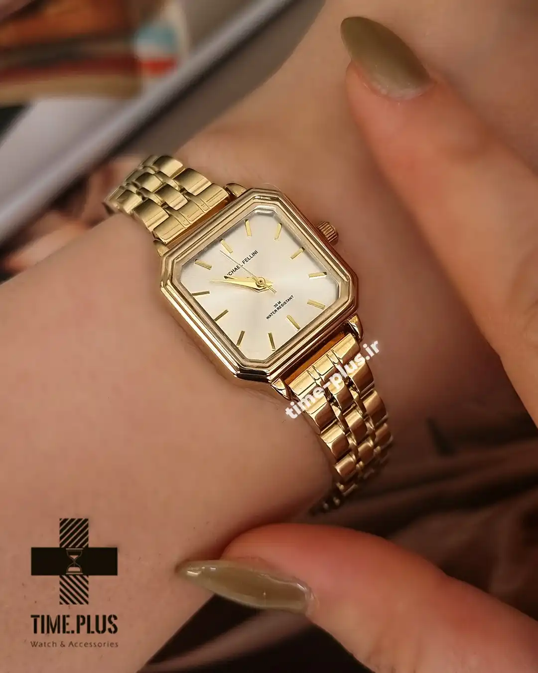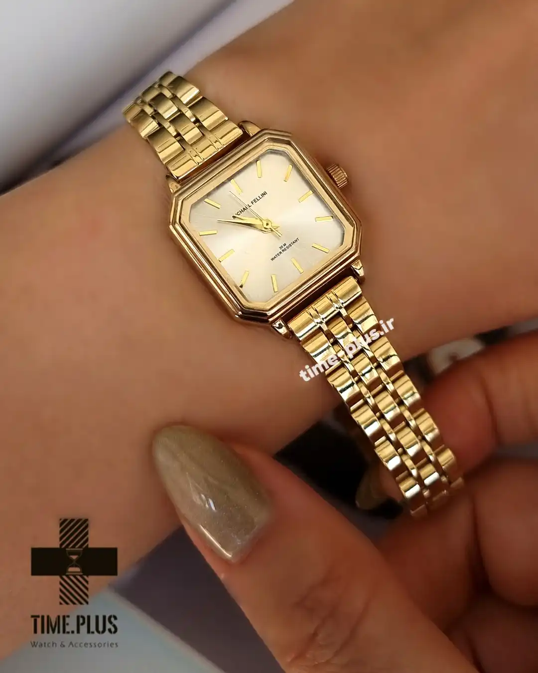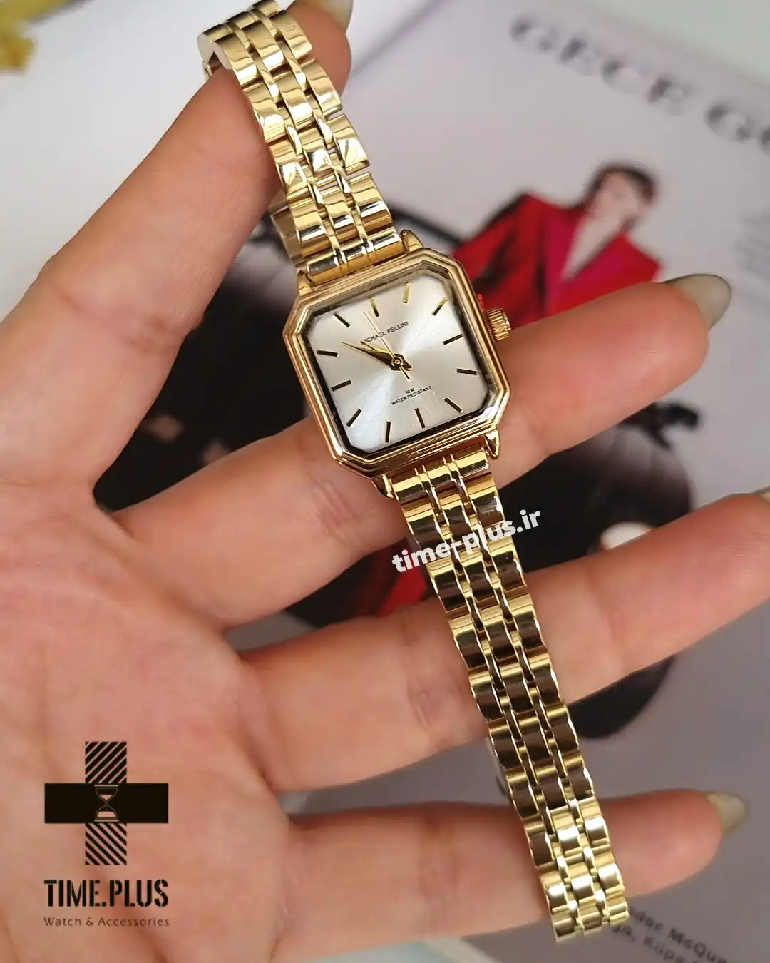 ساعت مچی زنانه مایکل فلینی مدل MF-2433L-F، نمونهای از زیبایی و ظرافت با صفحهای به سایز 23 میلیمتر و رنگ بدنه طلایی است.