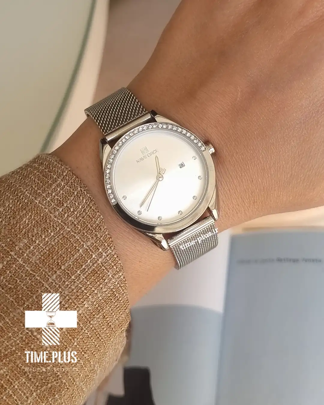 ساعت مچی زنانه نیوی فورس مدل NF5015، ترکیبی از elegance و استحکام برای بانوان است. این ساعت با طرح حصیری و بند نقرهای، ظاهری شیک و دلنشین دارد.