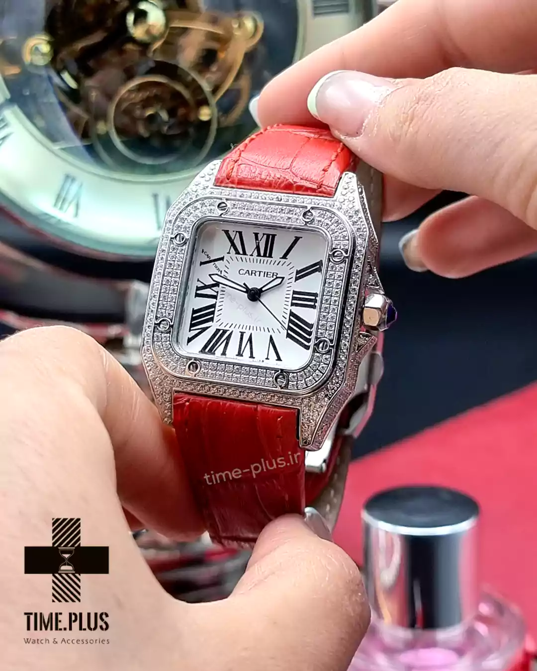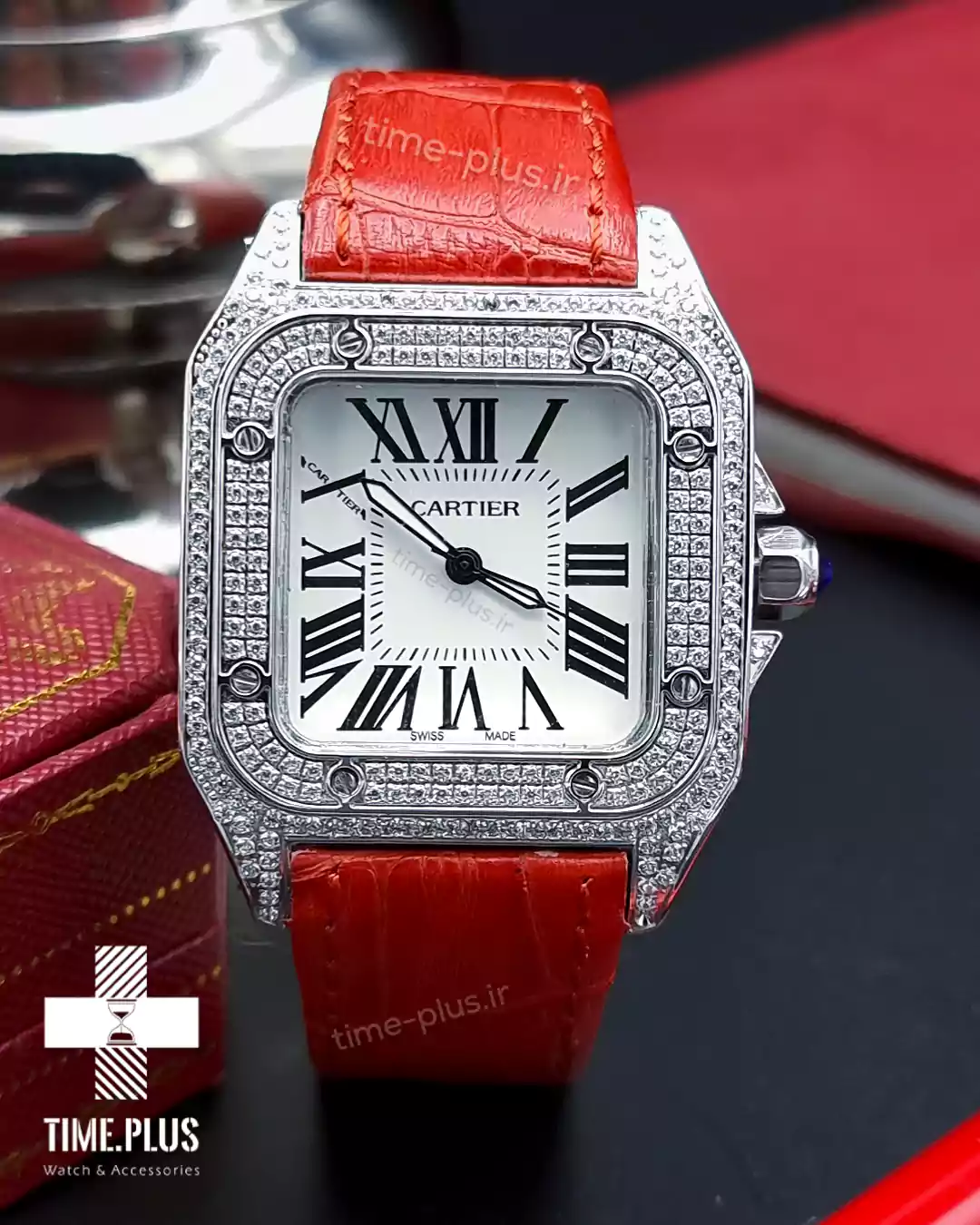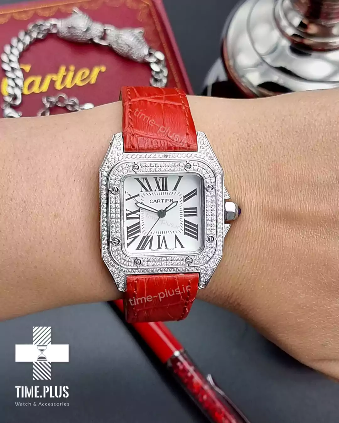 ساعت کارتیه سانتوس ۱۰۰ دور نگین ساعت سانتوس ۱۰۰ از برند معروف کارتیه، ترکیبی از طراحی زیبا و کیفیت بالا با رنگ قرمز خاص است.