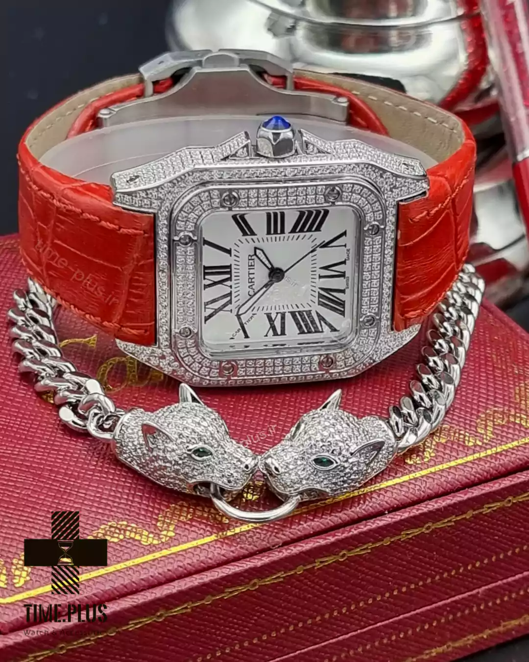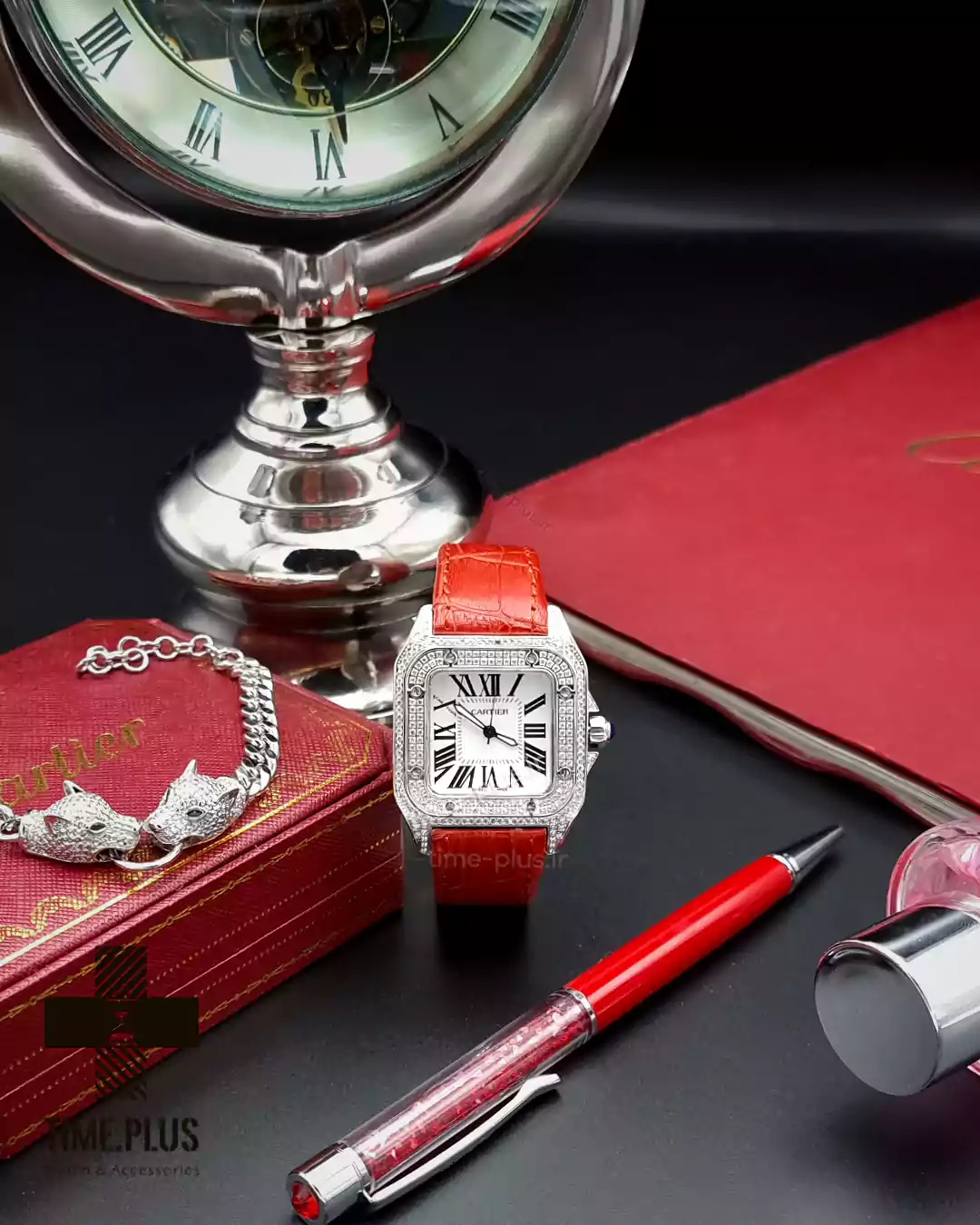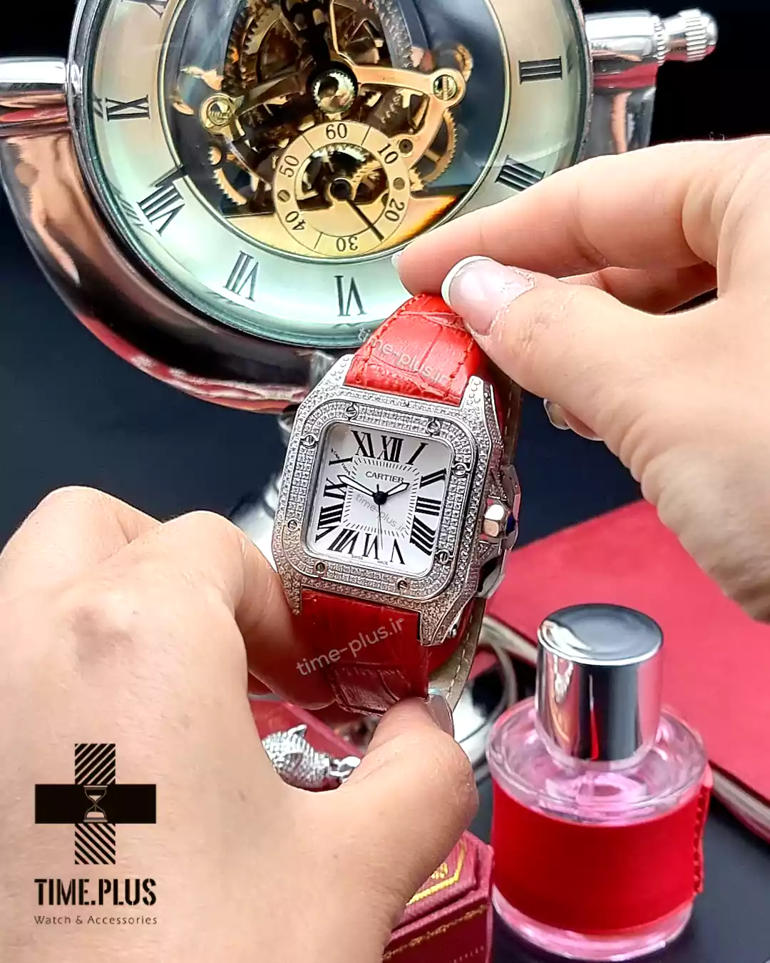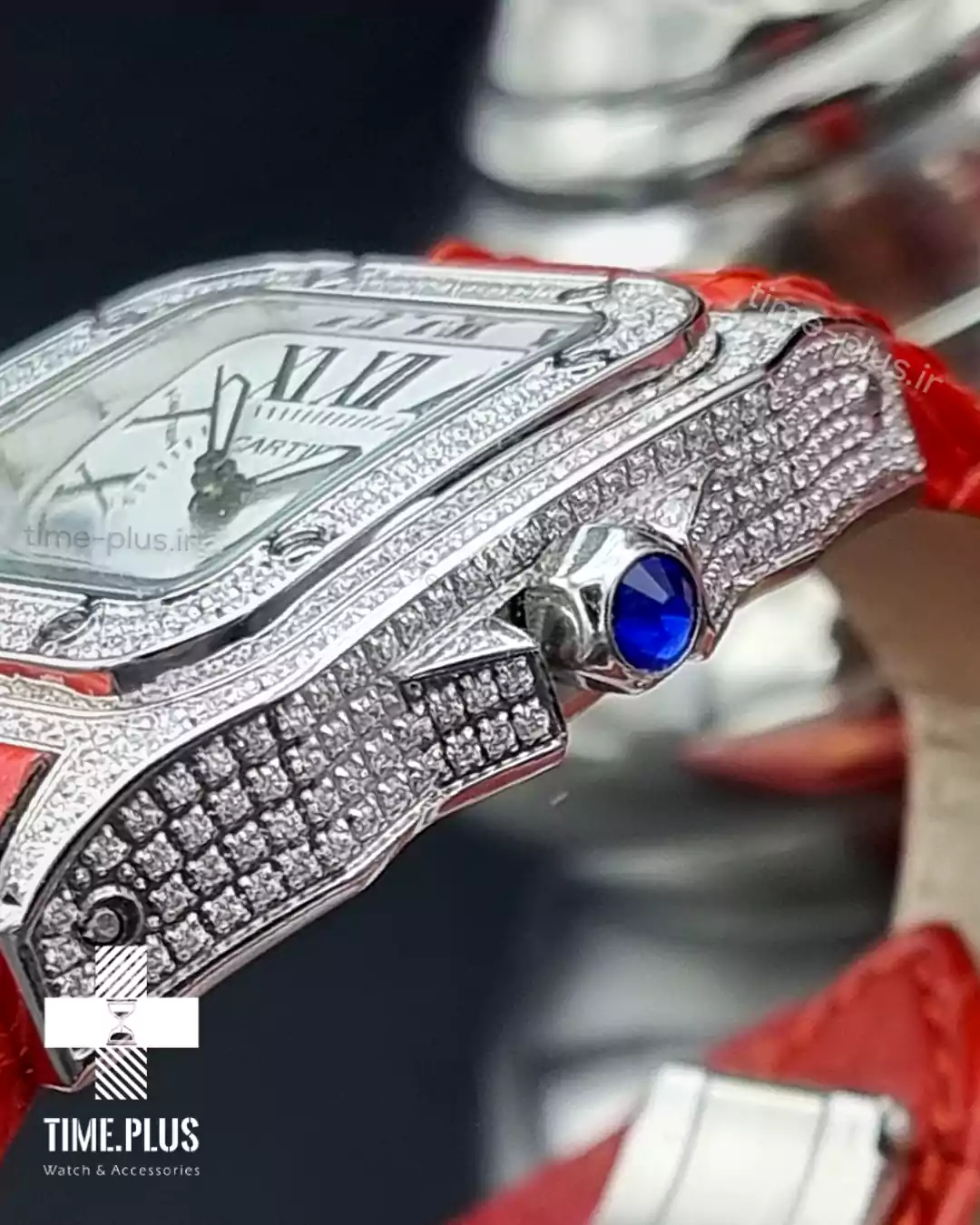 ساعت کارتیه سانتوس ۱۰۰ دور نگین ساعت سانتوس ۱۰۰ از برند معروف کارتیه، ترکیبی از طراحی زیبا و کیفیت بالا با رنگ قرمز خاص است.