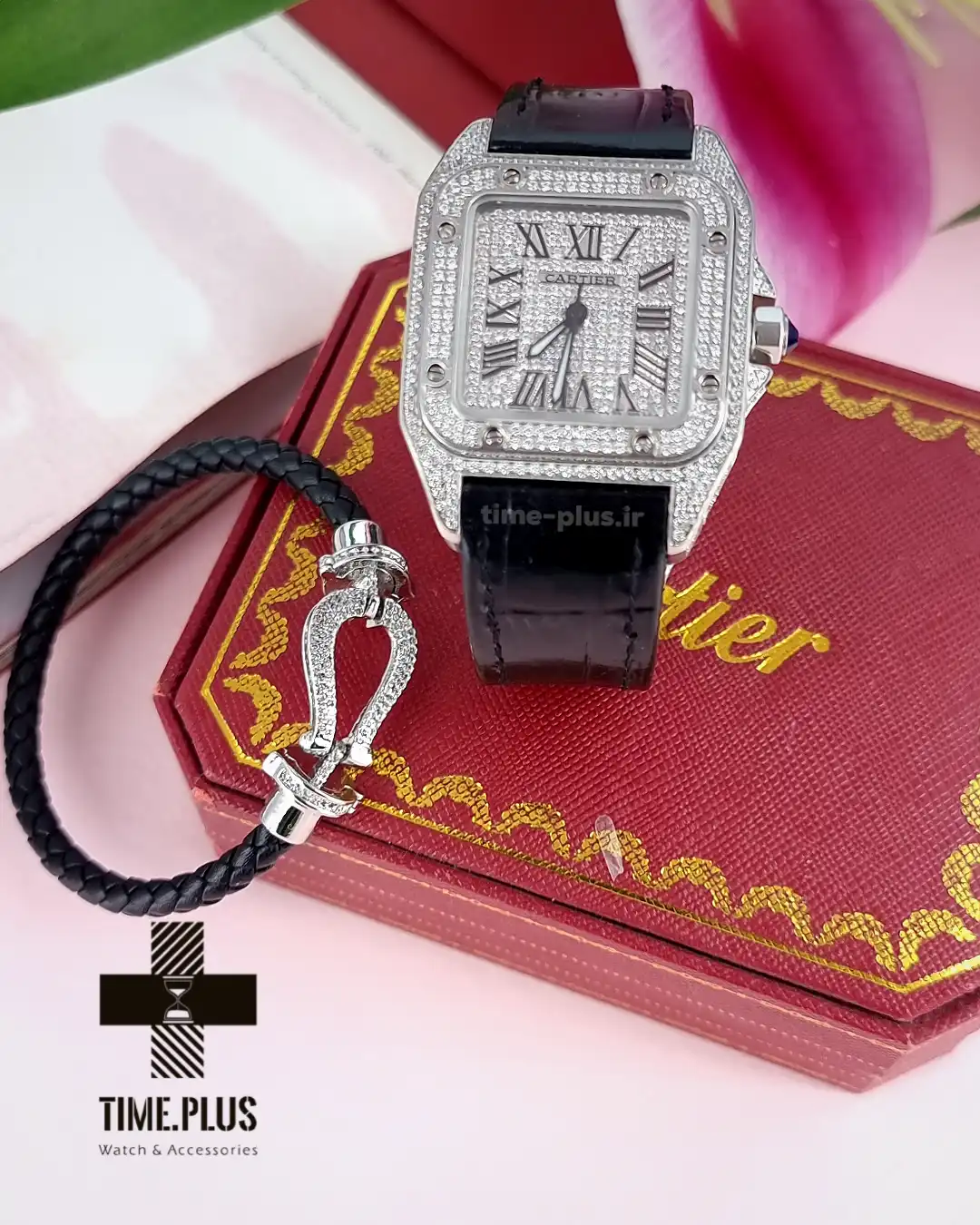 ساعت زنانه کارتیه مدل سانتز 100 فول نگین با طراحی منحصر به فرد و نگین های درخشان، جزء زیباییهای خاص این برند اصیل است.
