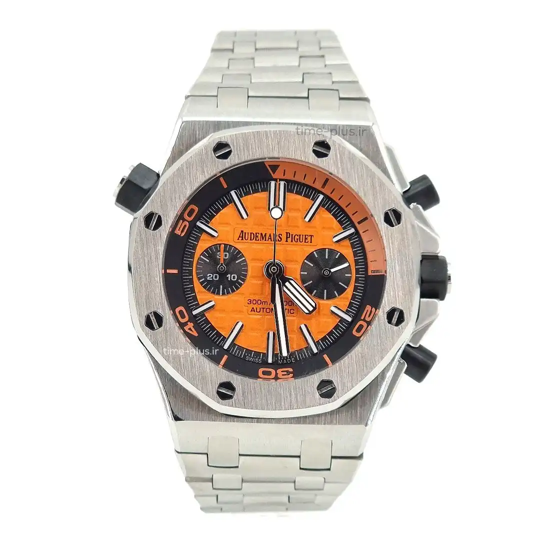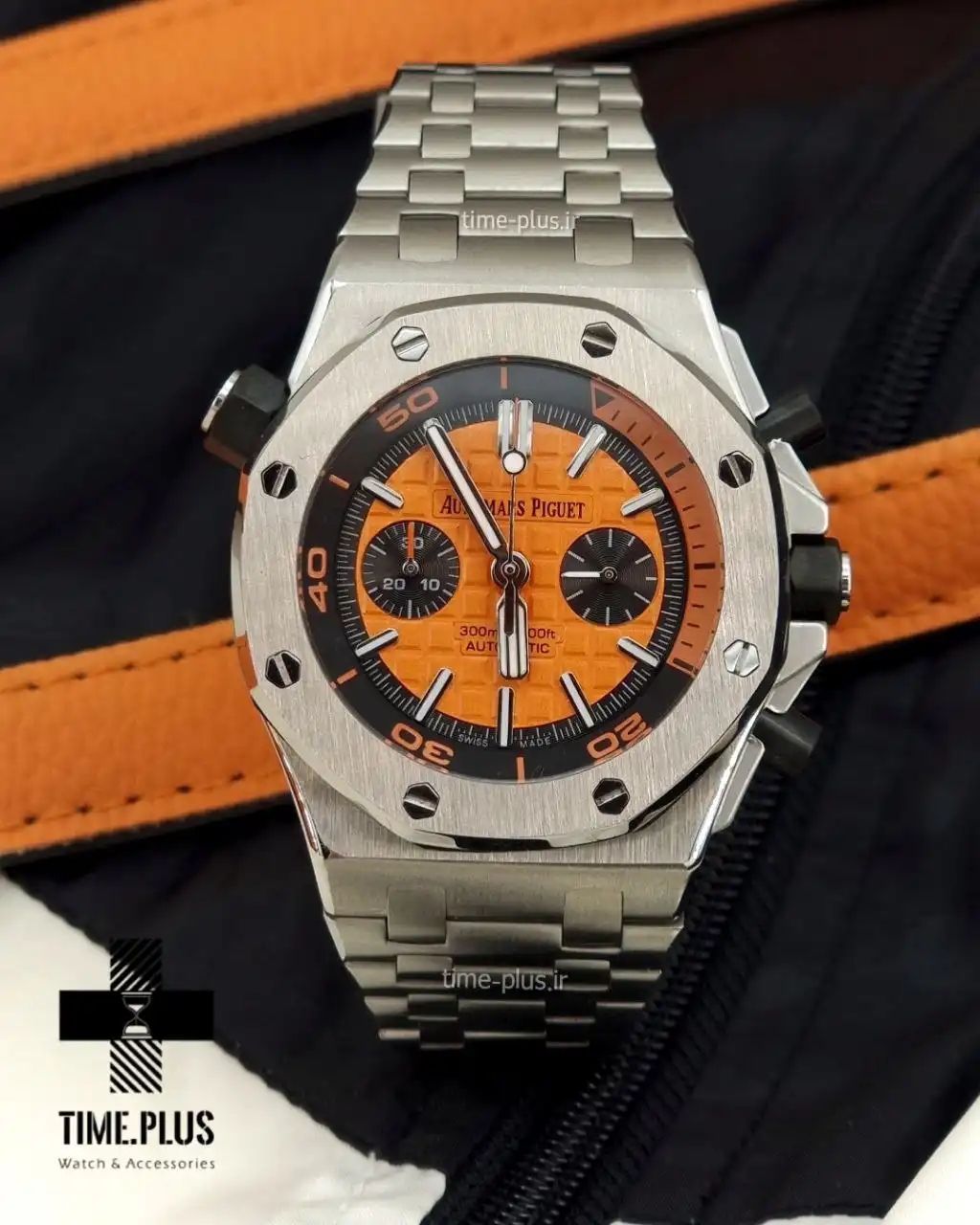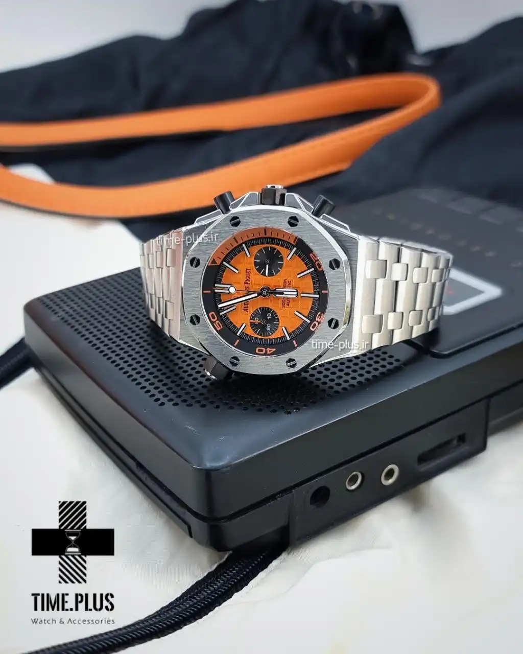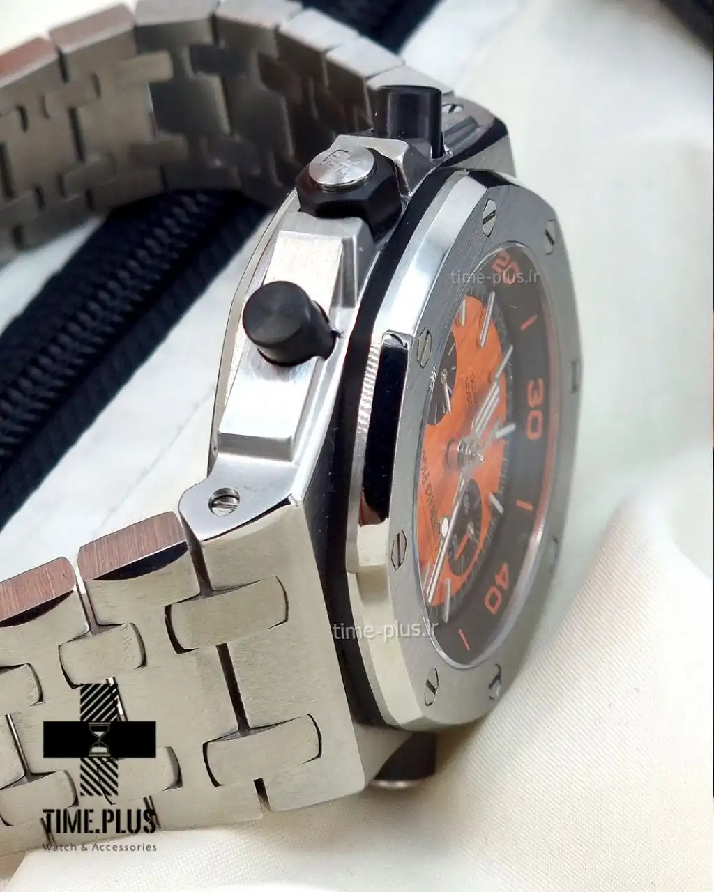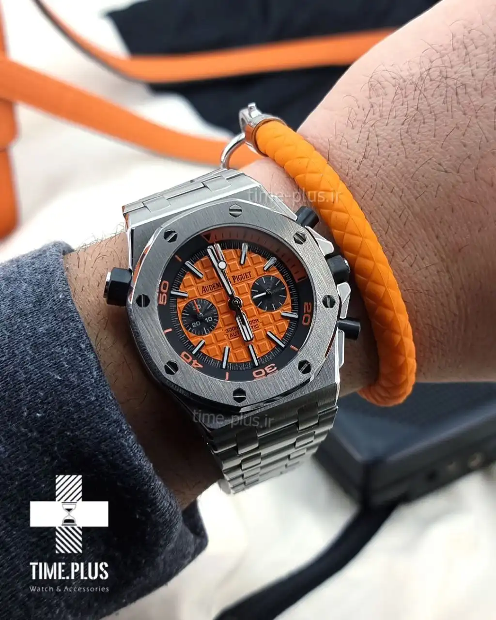 بند نقره ای و صفحه به رنگ نارنجی هارمونی زیبا و خاصی به وجود اورده که به جرات یکی از بهترین ترکیب رنگ هاست. رنگ نقره ای این ساعت اودمار پیگه که از جنس فلز استیل می باشد زیبایی این مدل را دو چندان کرده است.