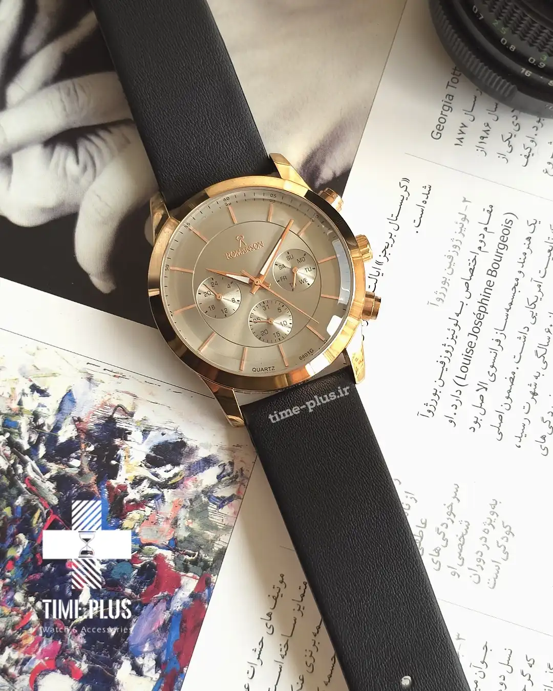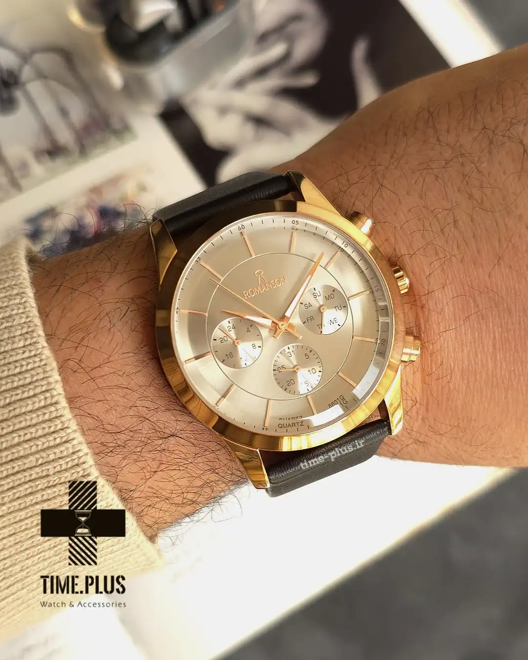 ویژگی های ساعت رومانسون مردانه فول دیت فرم گرد این ساعت مچی مردانه رومانسون بند چرم در کنار عقربههای تیز و شکسته، یک کنتراست قوی و تاثیرگذار ایجاد کرده که حس قدرت را به دیگران القا میکند.