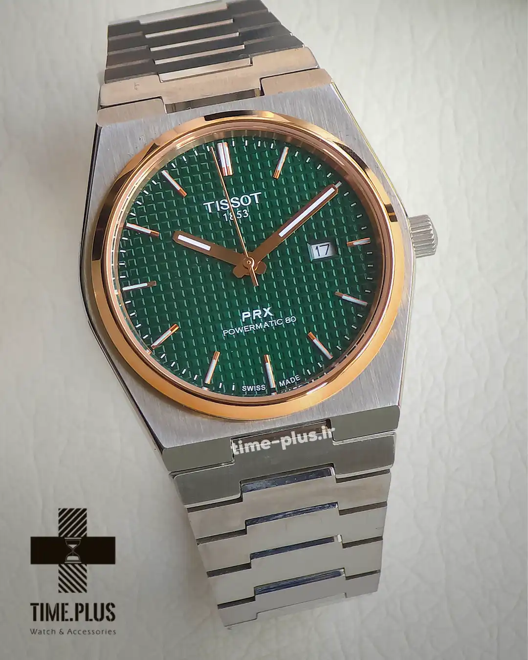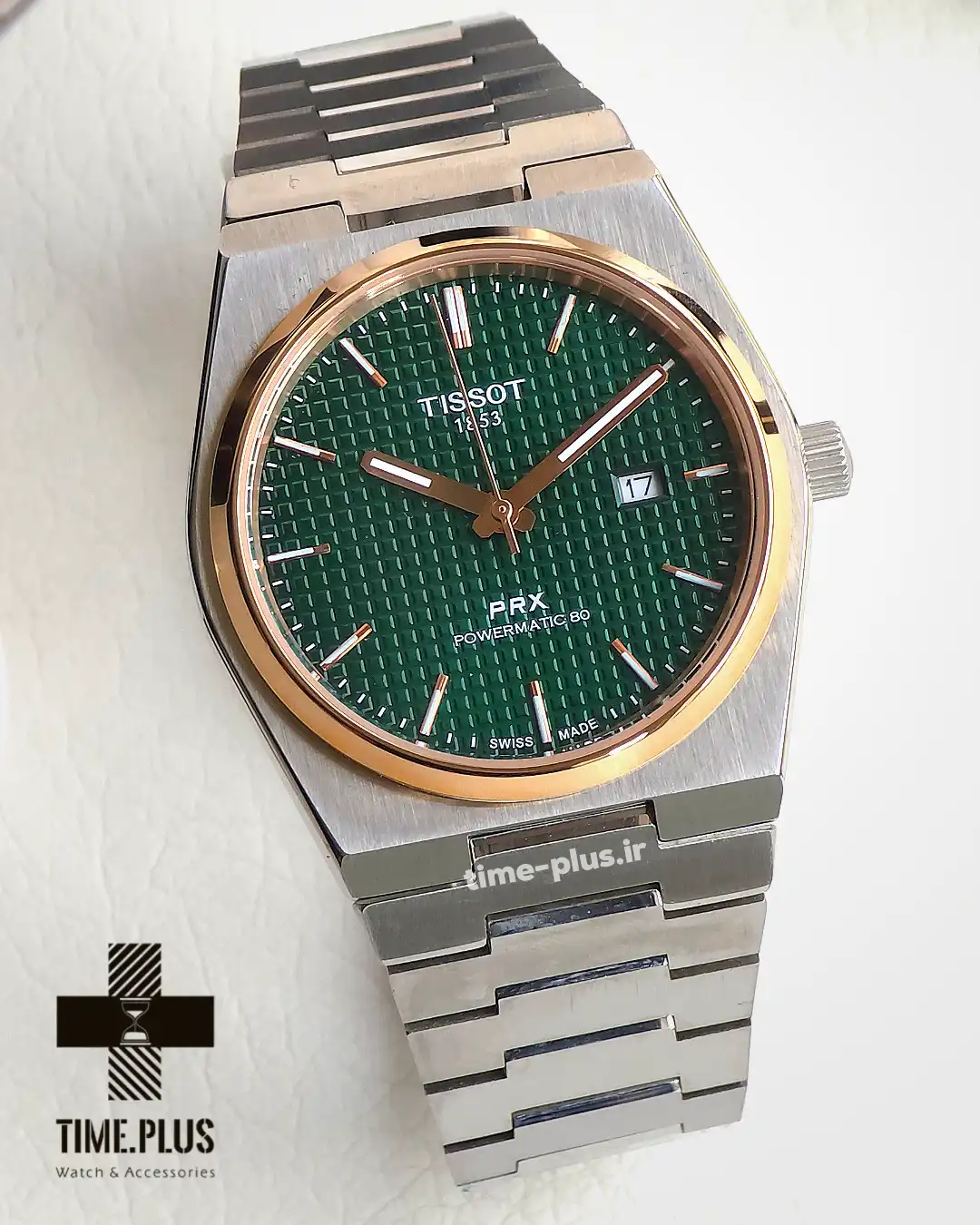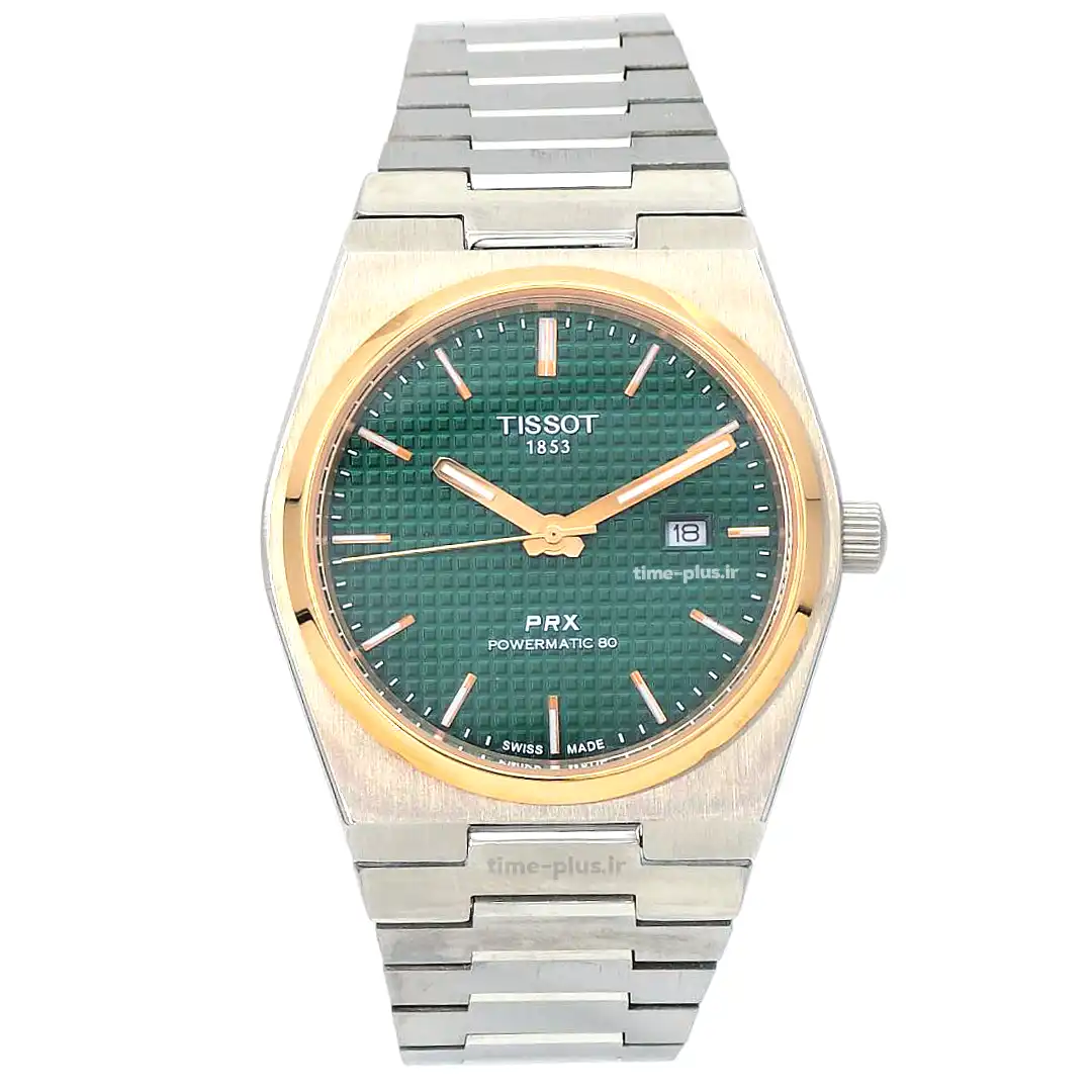 ساعت تیسوت مردانه مدل PRX با صفحه سبز و طراحی جذاب، از سری محبوب این برند است و کیفیت ساخت بالایی دارد.