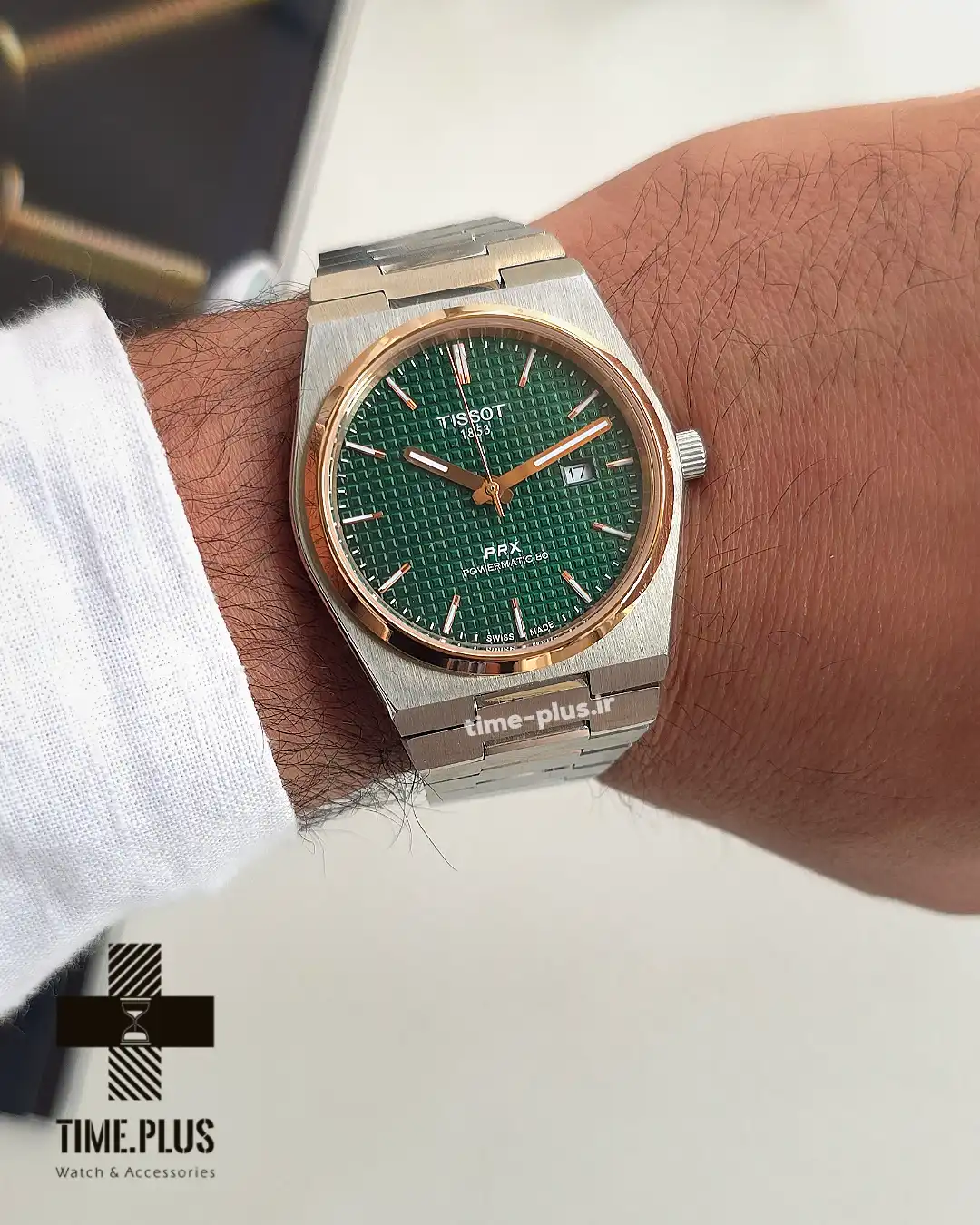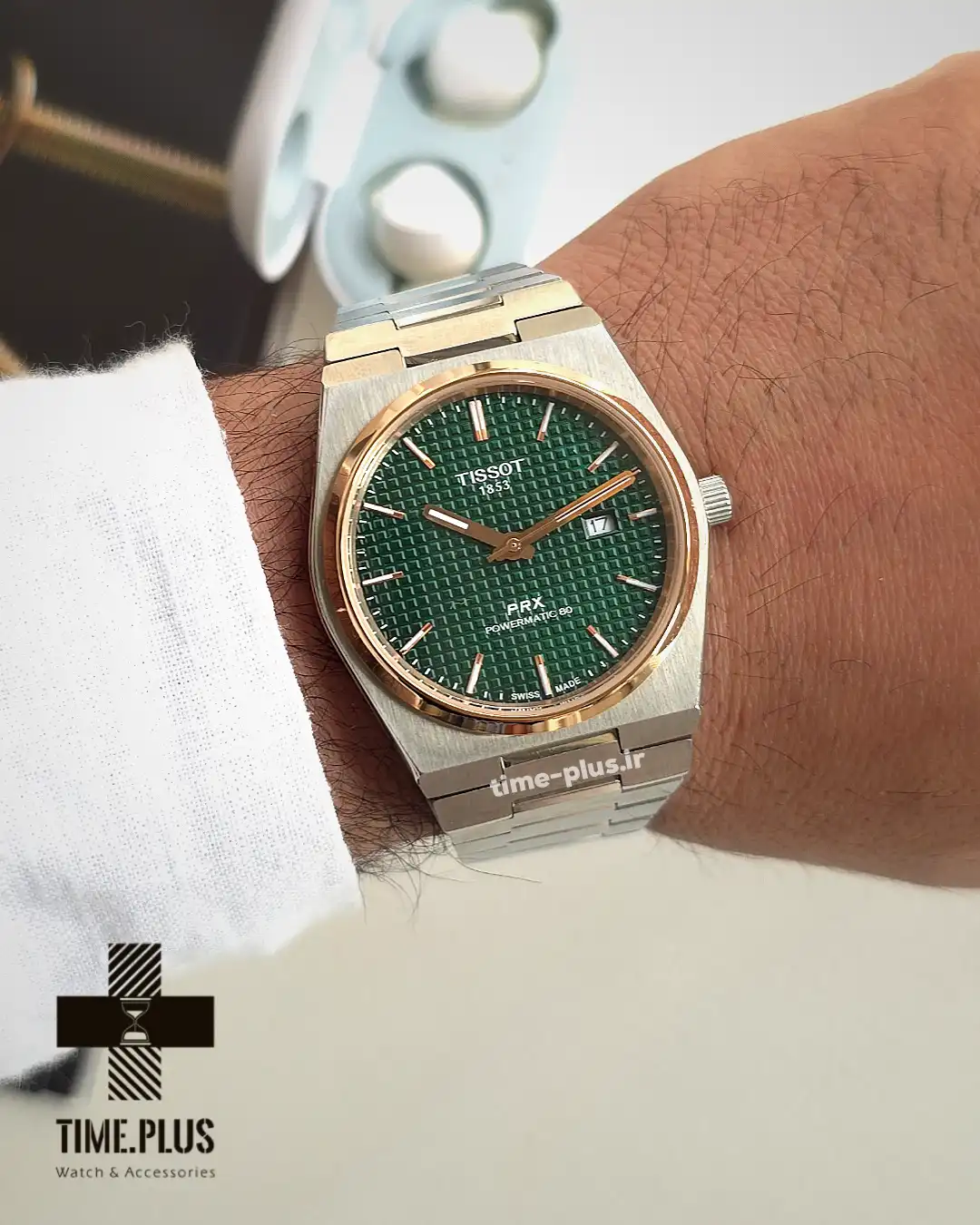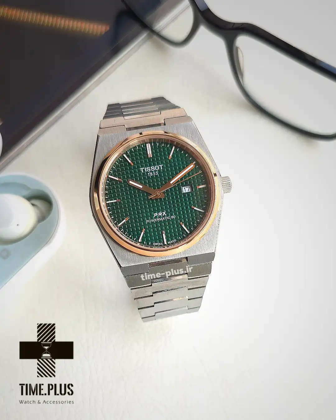 ساعت تیسوت مردانه مدل PRX با صفحه سبز و طراحی جذاب، از سری محبوب این برند است و کیفیت ساخت بالایی دارد.