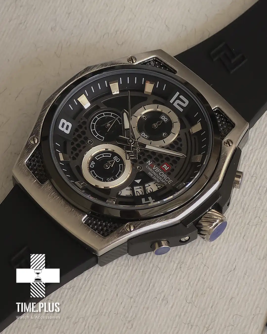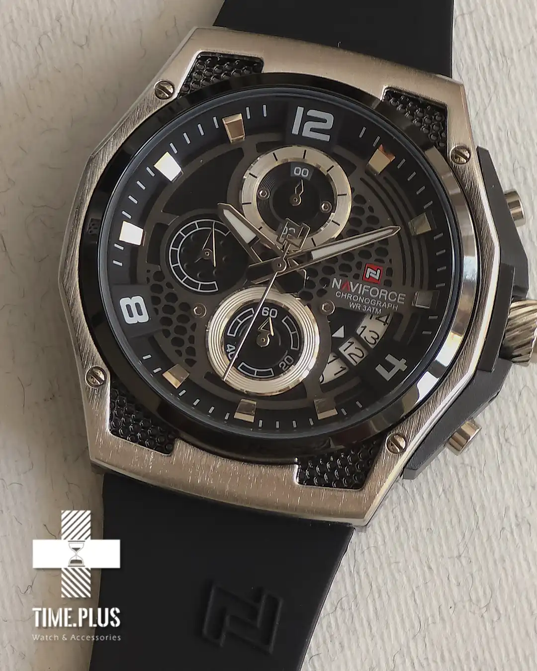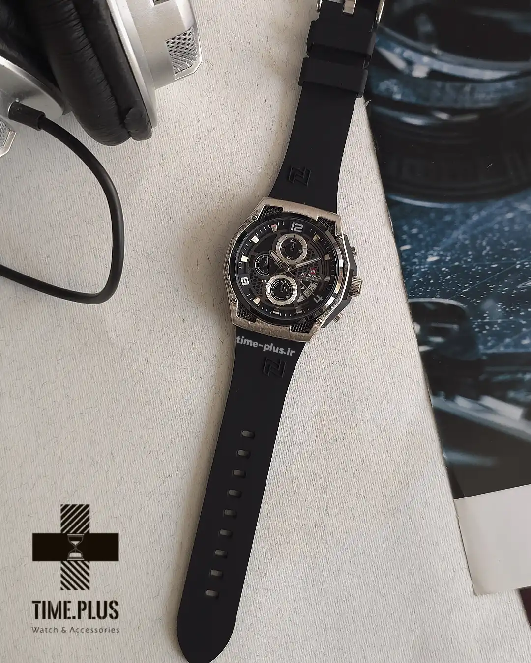 ساعت مچی نیوی فورس مدل NF8051 یک ساعت شیک و اسپرت با صفحه مشکی است که طراحی جذابی دارد.
