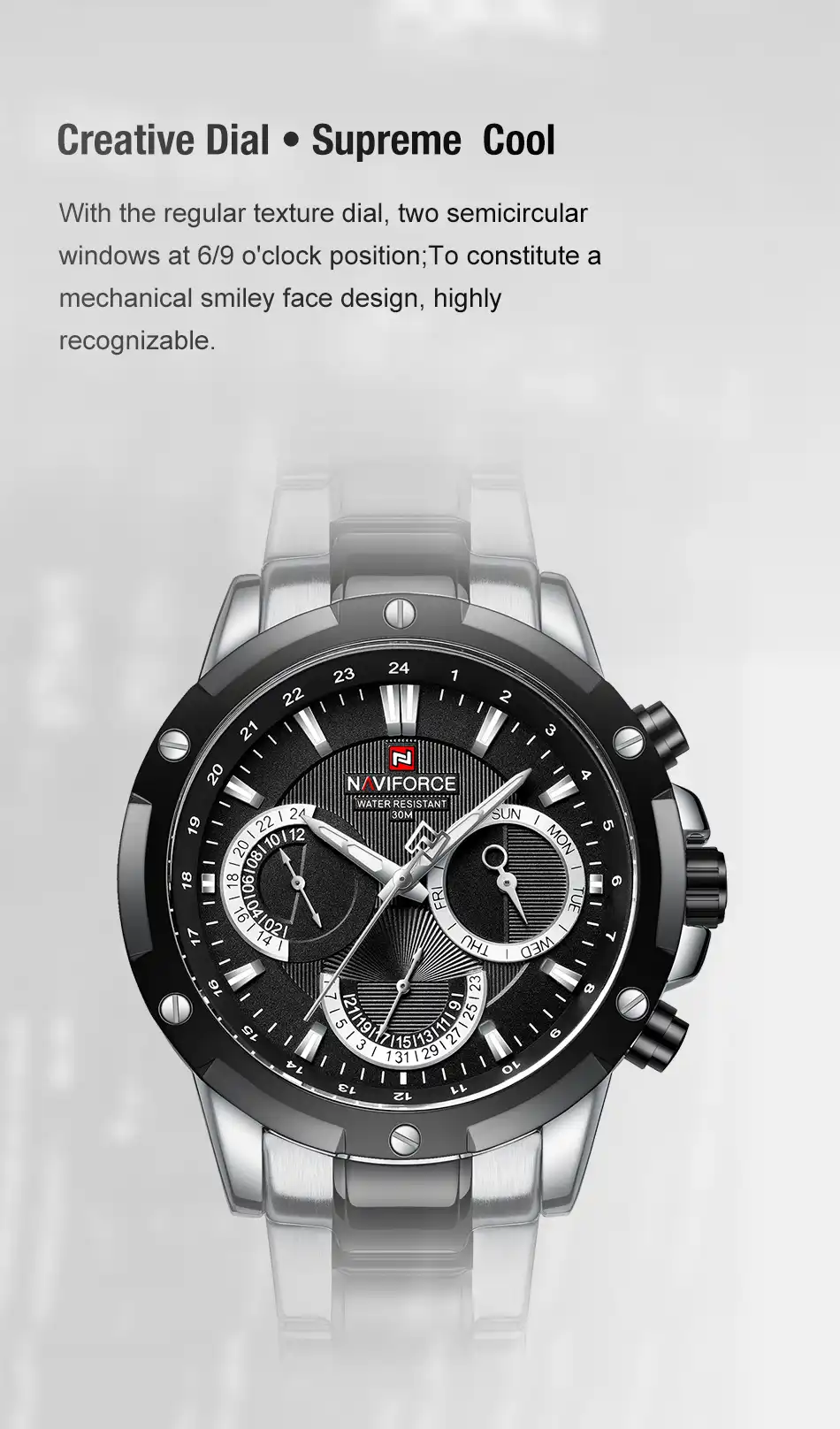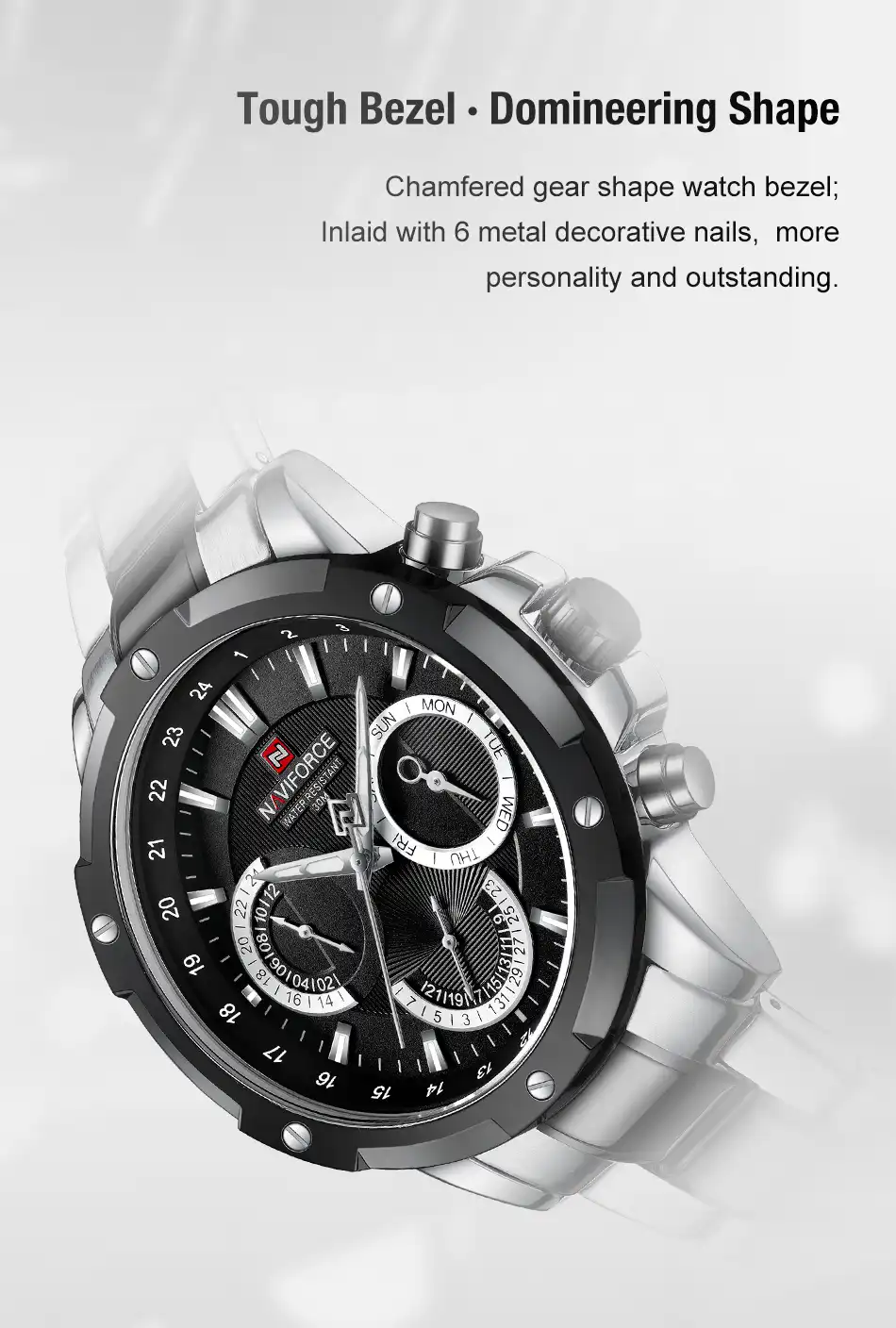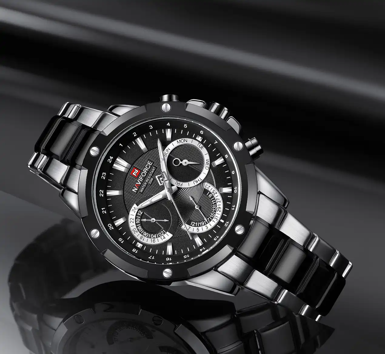 ساعت نیوی فورس مدل NF9196 با طراحی منحصر به فرد و کیفیت بالا، انتخابی مناسب برای آقایان جوان است.