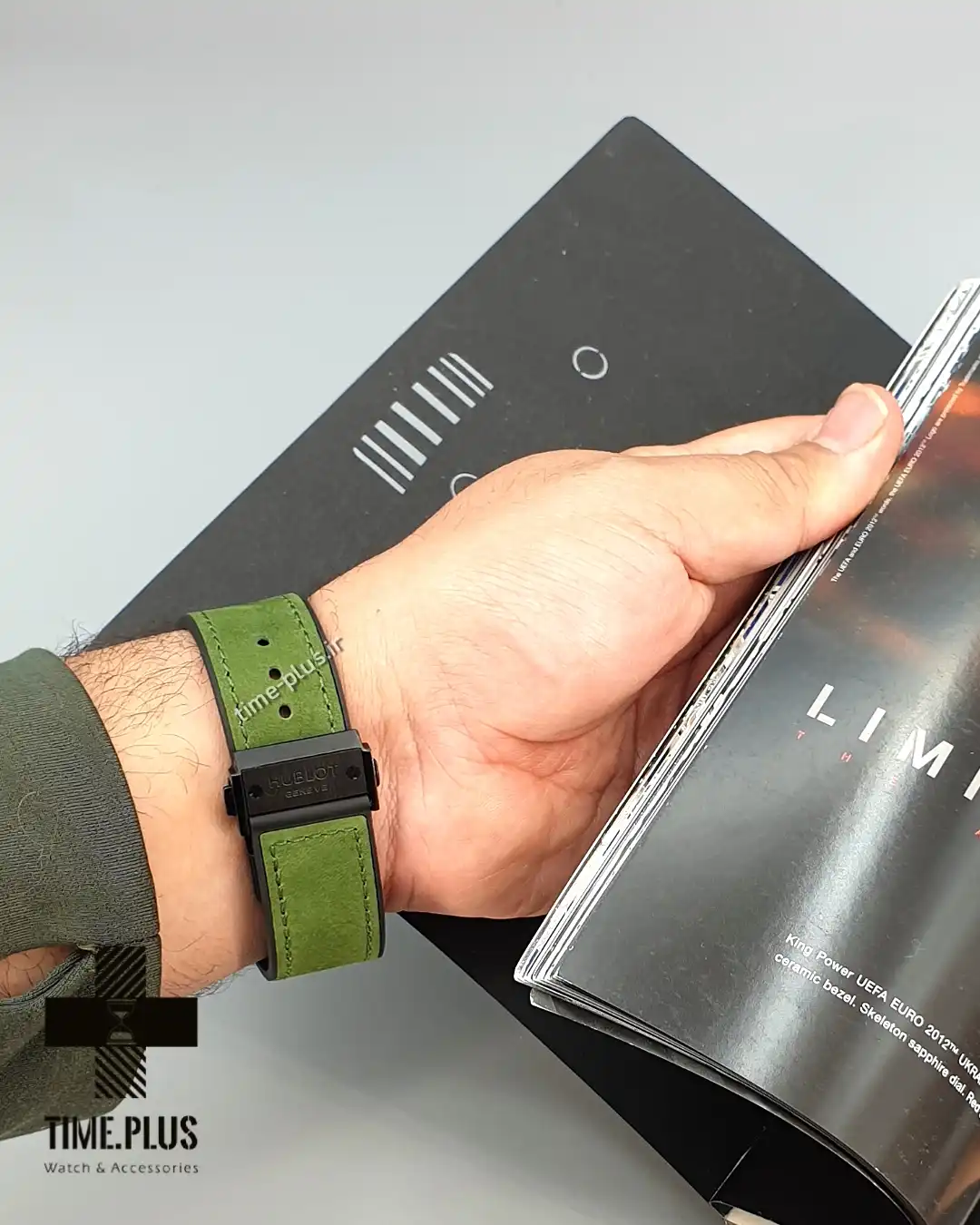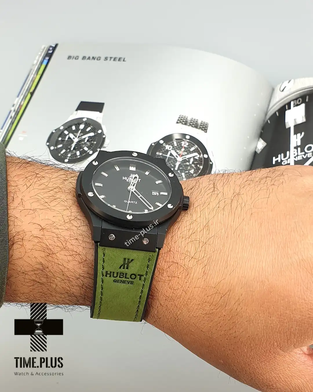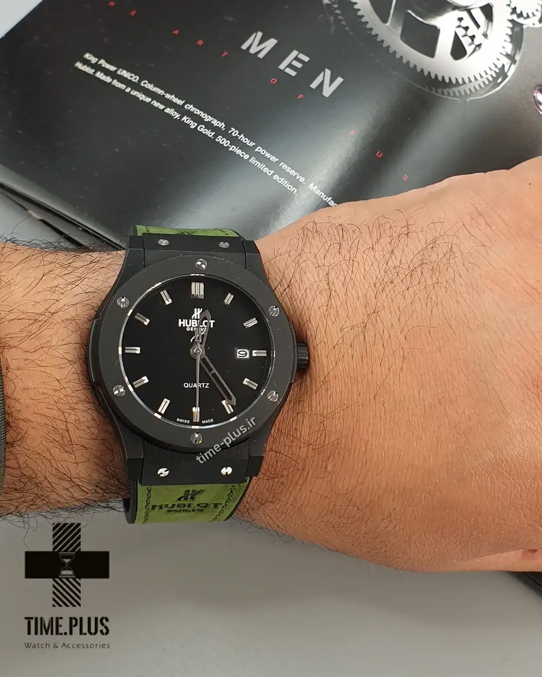 ساعت مچی مردانه هوبلو قاب این ساعت هوبلو به رنگ مشکی مات است برخلاف آن عقربه و اندکس های ساعت به رنگ نقره ای میباشد که تضاد زیبایی را به تصویر میکشد. طراحی بند این ساعت مچی عقربه ای هوبلو به رنگ زیبای سبز میباشد و از رویه جیر و زیره رابر ساخته شده است.